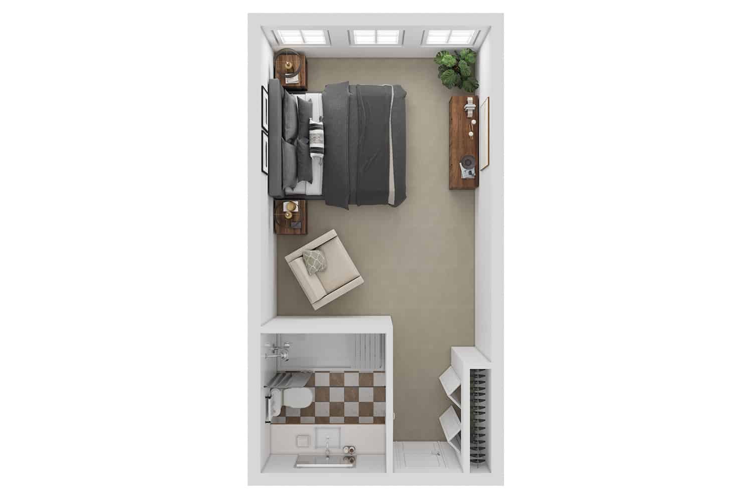 Our spacious studio apartments are thoughtfully designed to offer the perfect blend of comfort and privacy, featuring a cozy bedroom and a full private bath. It’s your personal space to relax, recharge, and feel at home.